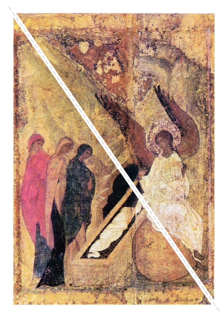 Nejdříve si pomocí jednoduché linie vedené z horního levého rohu k dolnímu pravému rohu ikonu rozdělíme na dvě části. Levou část tvoří ženy a hrob, pravou část anděl sedící na kameni. Náhodná kompozice? Naopak – přesně vyměřená, se silným poselstvím. Na jedné straně stojí hledající člověk uprostřed prázdnoty a bolesti, na druhé straně přichází Boží odpověď.